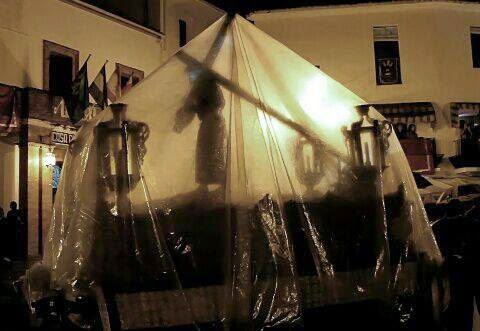 Miércoles Santo: Salió la Virgen que bajó al Cristo donde esperaba el Cristo acompañado de la Banda Municipal. Hicieron el recorrido normal hasta llegar a la plaza donde empezó a llover y aligeraron el paso.