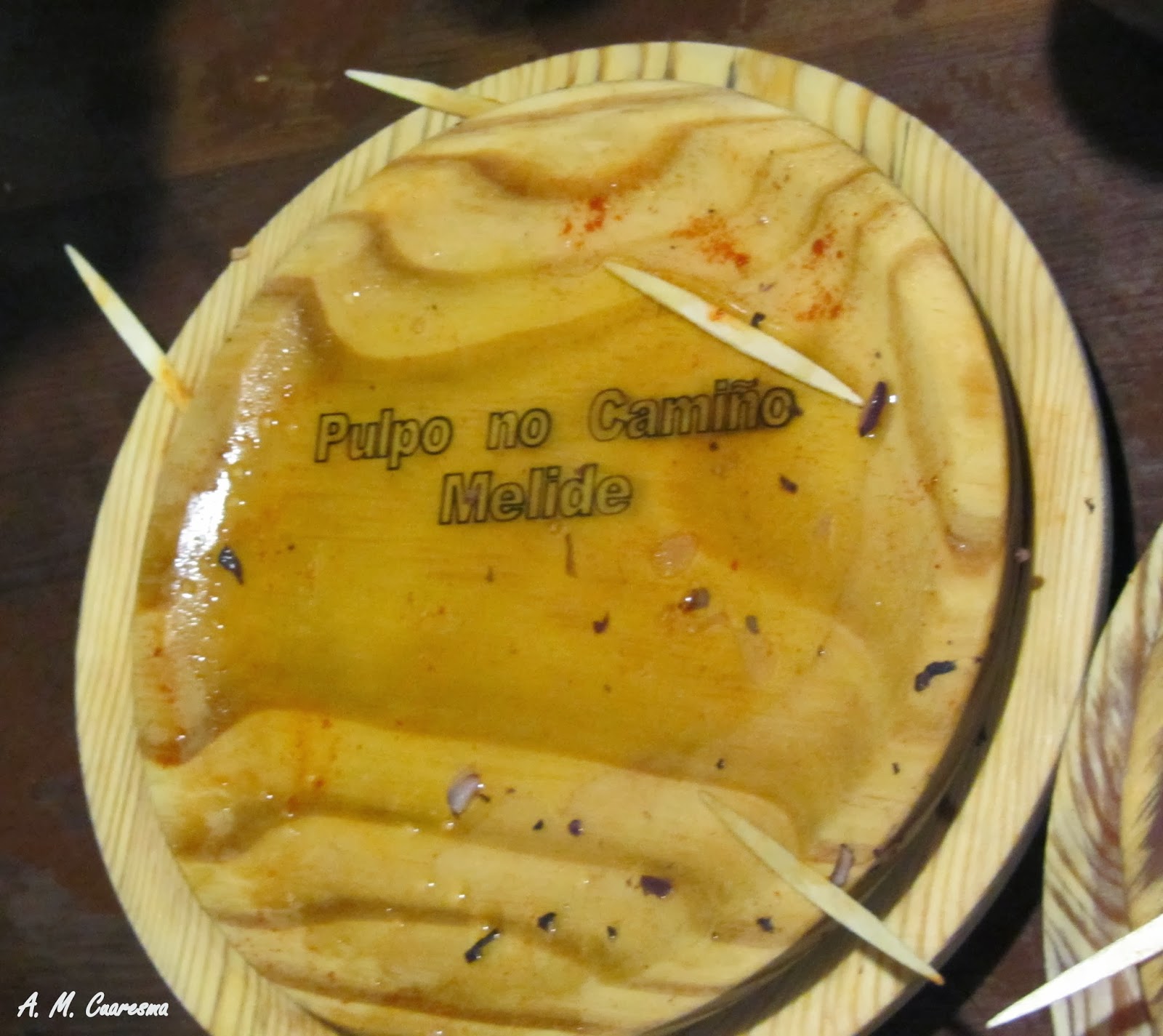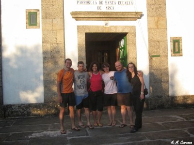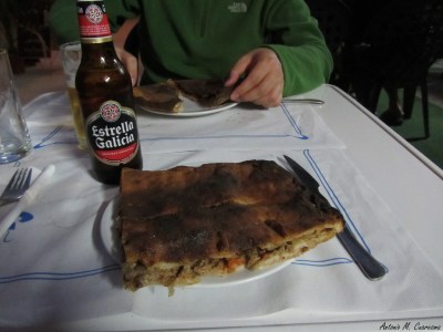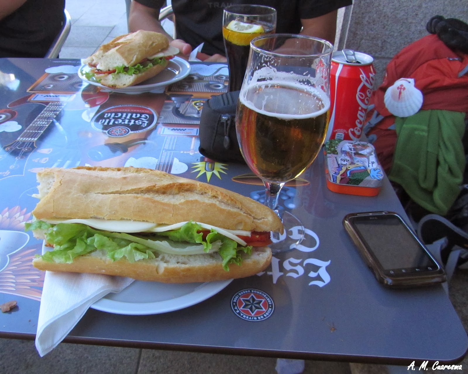 Seguimos buscando. Encontrando esta vez con más fortuna otro lugar que al menos de aspecto, tenía mucho mejor pinta, donde iba a parar. Su nombre es O Lagar, del todo recomendable. Pero en este lugar ya nos ponemos de acuerdo para comer todos juntos, con Jorginho, Antonio, Marta, Reyes y Silvia, compis peregrinos de Valencia. os doce hacemos una gran comida comunitaria ya en Santiago. El menú está bien servido, aunque cierto que para unos mejor que para otros (no pedir empanadilla, vamos, por el tamaño de esta, nada que ver con la de Triacastela).