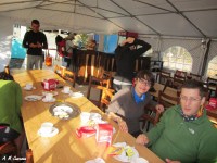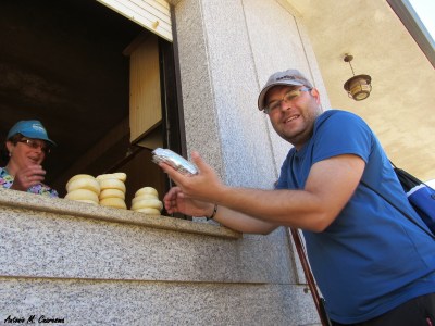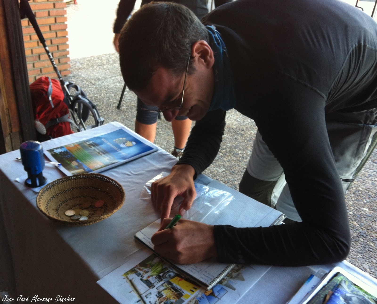 -Buenos días hijos… (nos responde una señora mayor que se encuentra en la mesa donde se sella la credencial y con la que echamos un buen rato hablando, sobre el camino, la vida, y curiosamente nos comenta que está ahí porque la joven que está frecuentemente había ido a desayunar, pero que ella no pretendía quitarle el puesto ya que por estar ahí le pagaban unos cuantos euros). Por supuesto esta mujer también se quedó con una estampa de San Mamés, que además le hizo algo de ilusión… a ella y a mí que se la quedase. Estuvimos un buen tiempo hablando con ella.