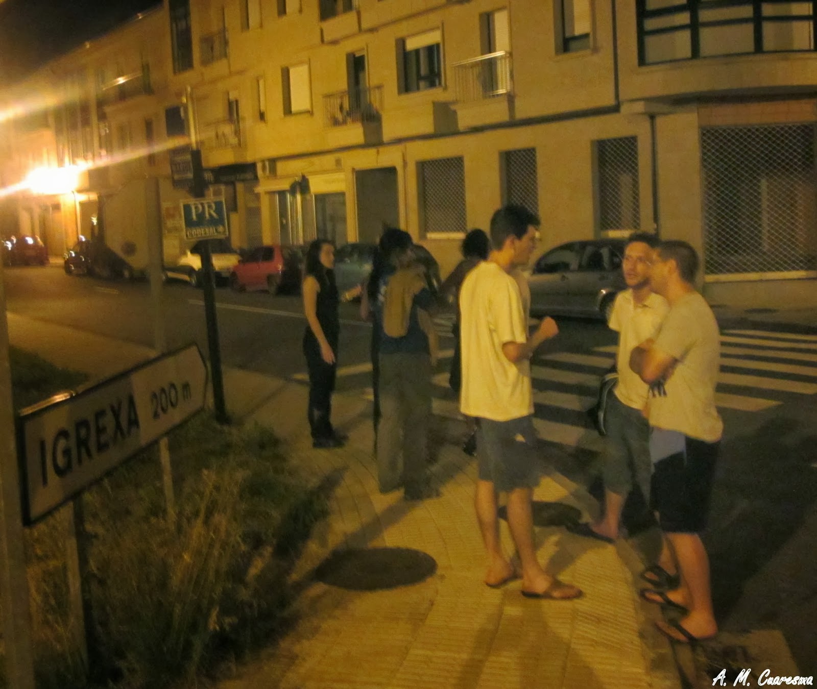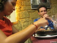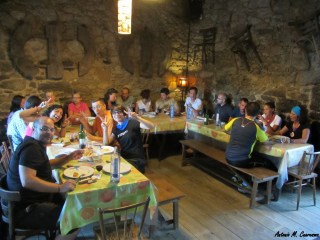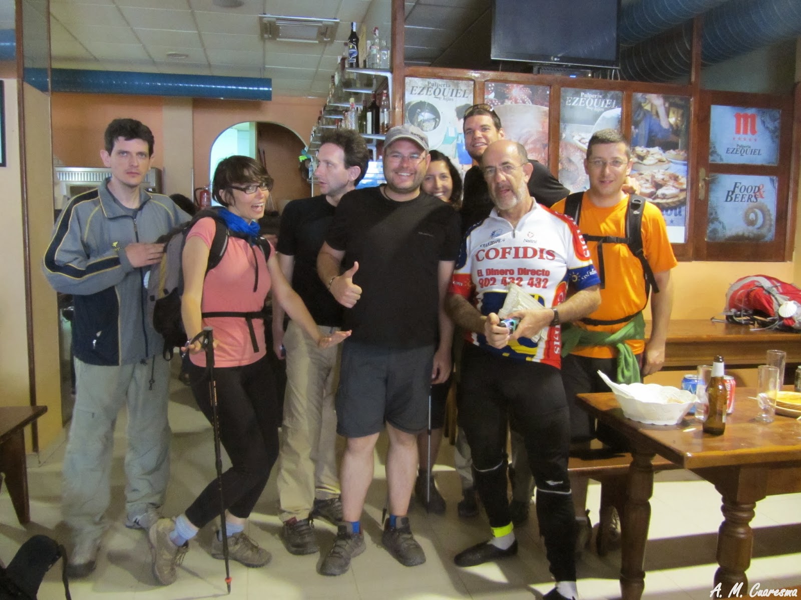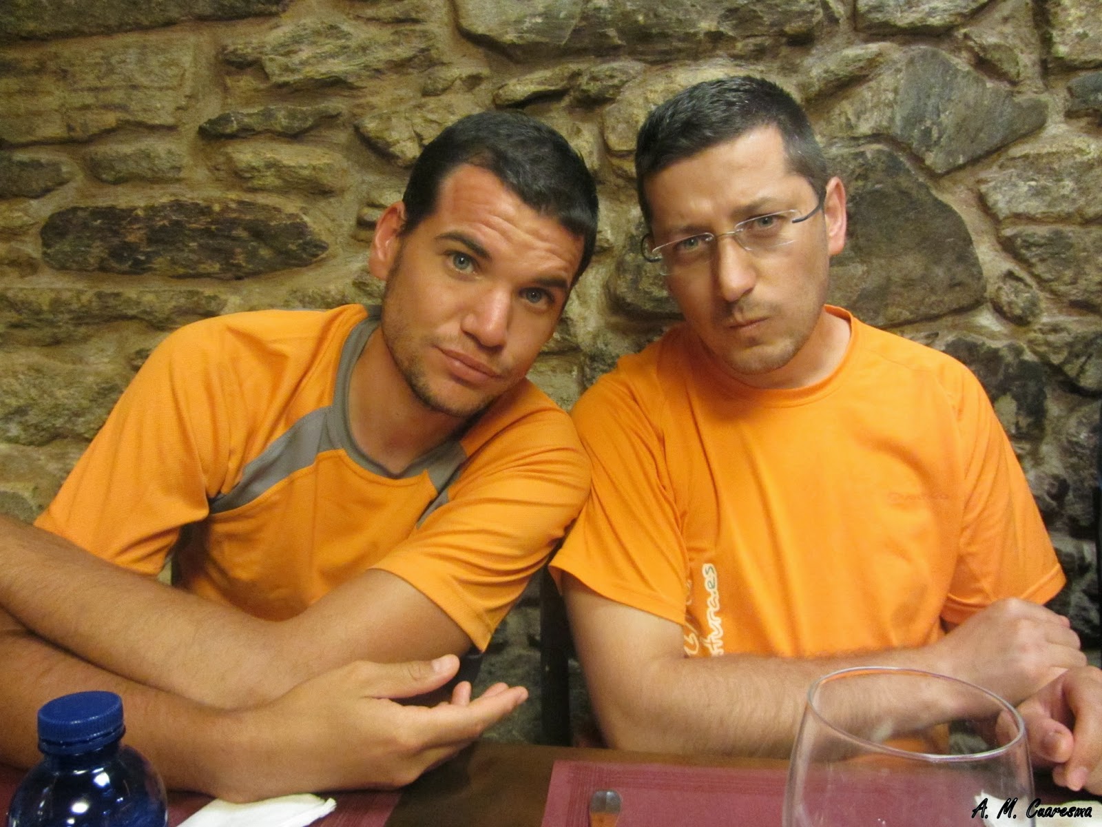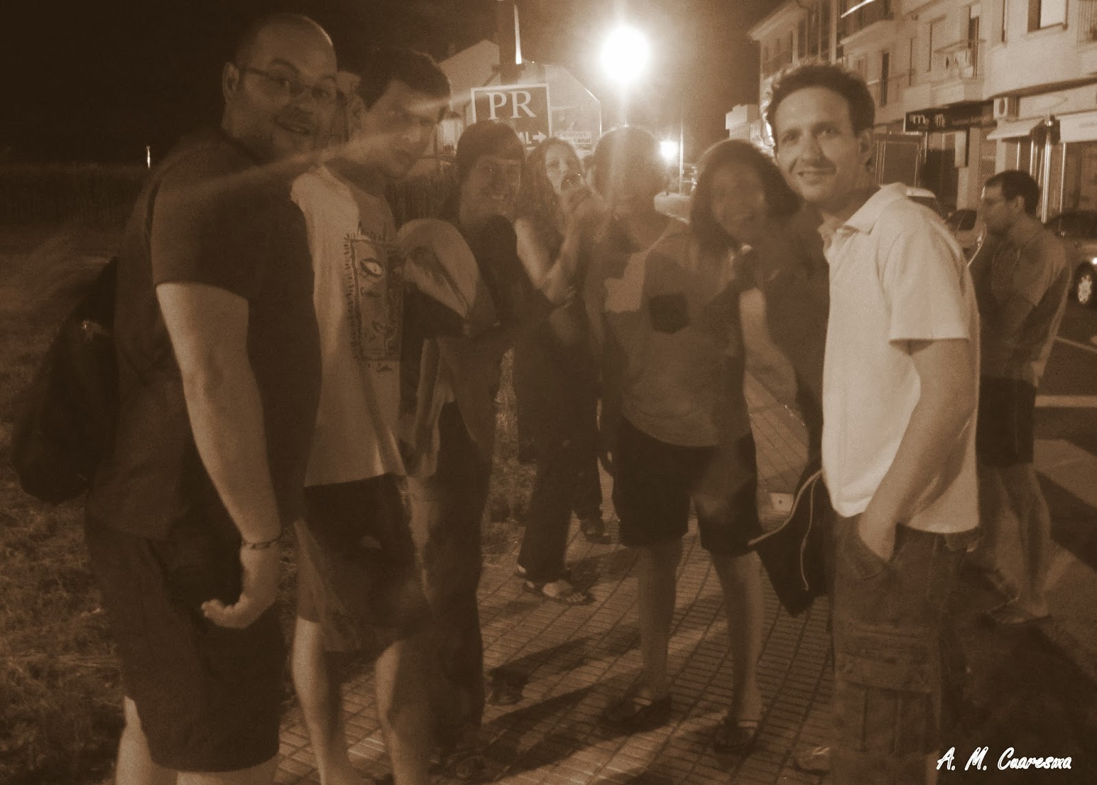 Cae la tarde, y por el pueblo nos encontramos con Reyes, Marta y Silvia, las chicas de Valencia, y quedamos con Antonio y Jorgiño. Buscamos un lugar para cenar juntos, y recaemos en el del almuerzo, esta vez en el interior que es donde cabemos los once. Nos atiende el mismo camarero, que sigue echando la peoná, aunque ya un tanto más calmaillo.