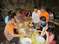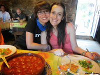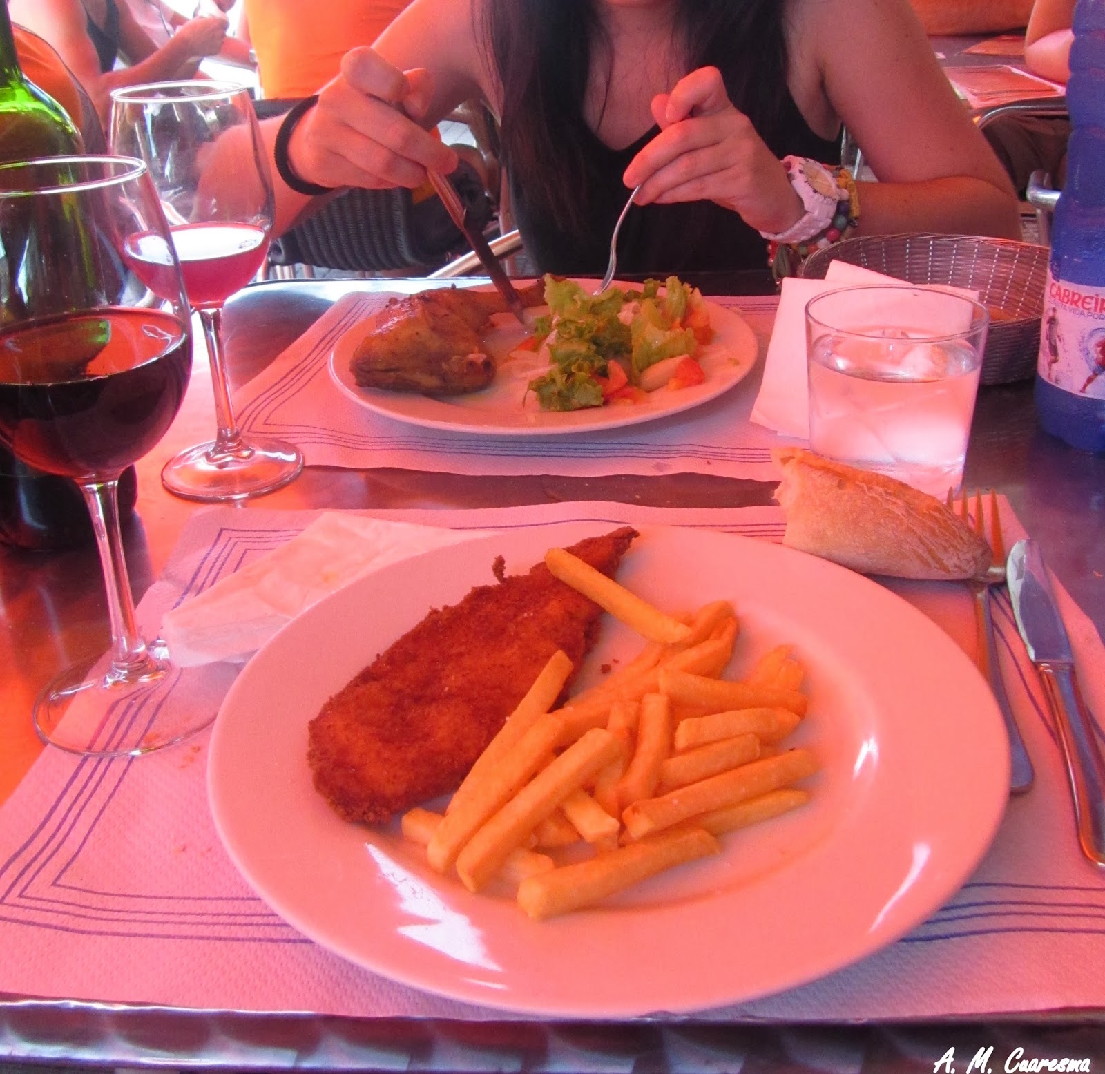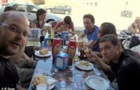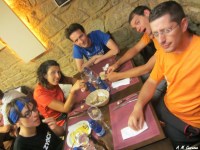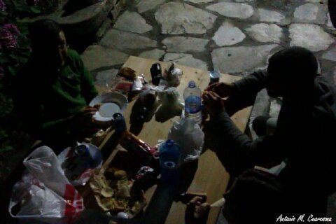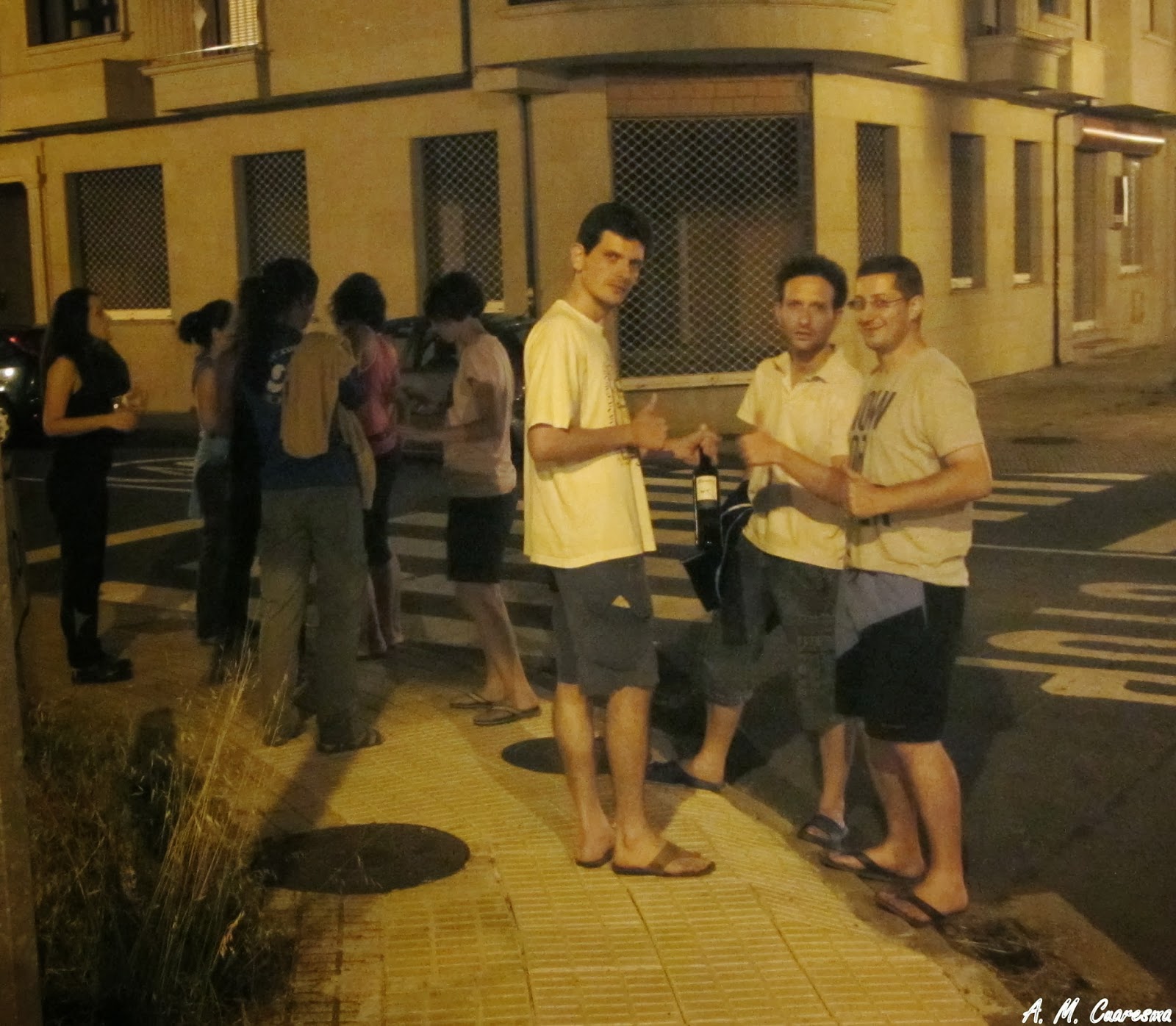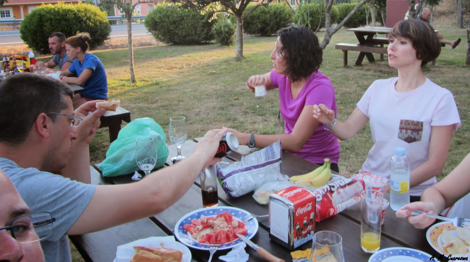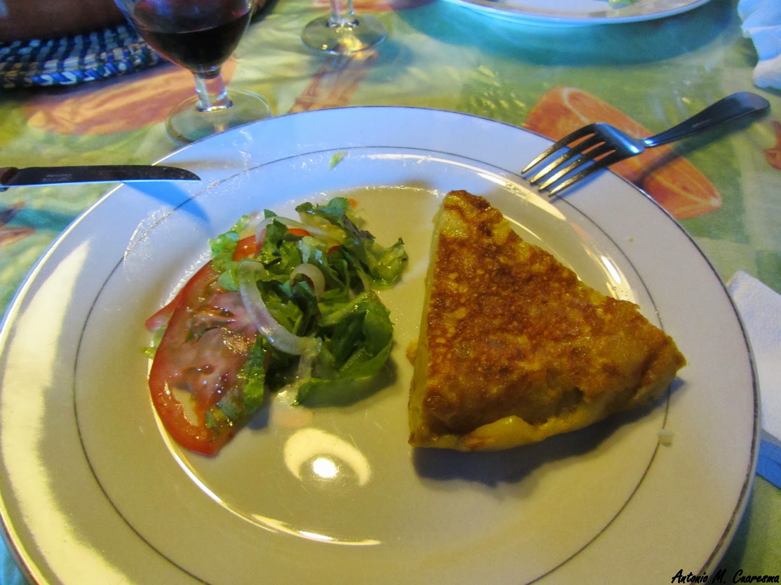 Cae la tarde, y por el pueblo nos encontramos con Reyes, Marta y Silvia, las chicas de Valencia, y quedamos con Antonio y Jorgiño. Buscamos un lugar para cenar juntos, y recaemos en el del almuerzo, esta vez en el interior que es donde cabemos los once. Nos atiende el mismo camarero, que sigue echando la peoná, aunque ya un tanto más calmaillo.