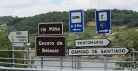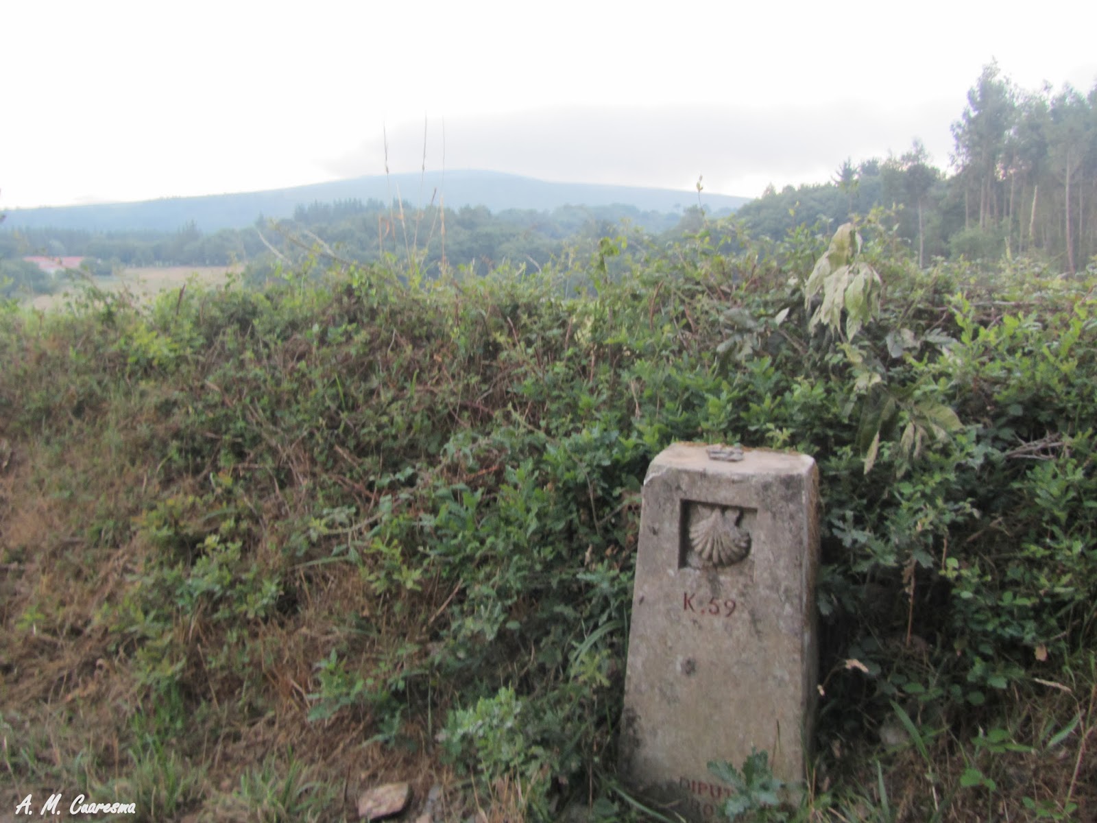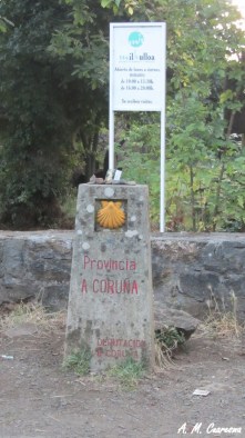 Un mojón con la cruz de Santiago en el centro, y el escudo de Galicia a la derecha y el de la Provincia de Lugo a la izquierda nos indica que continuamos desde este punto la parte del Camino gallego. Bajo los blasones una inscripción con el símbolo esquemático de la concha, en el centro Camino de Santiago y a la derecha la bandera europea. Quedan desde este punto unos 150 km hasta la Catedral de Santiago de Compostela.