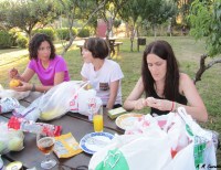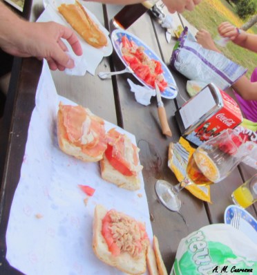 Cerca de las 21:00 cogemos los manjares y nos vamos a buscar un lugar donde cenar, que conste que se lo dijimos al muchacho (Jacobo) y a las de Madrid. Llegamos así a un lugar, donde ponía en un cartel «Camino de Santiago. Hospital». Es un fantástico merendero, junto al pueblo, rodeado de verde, y en agosto, el agua corre por una rivera que lo delimita y donde además hay elementos para hacer ejercicio. ¡Hay hasta barbacoa!. (En algunas fuentes se cita a este enclave como Las Herrerías (10 hab.km2 -También llamado San Julián-) y Hospital (26 hab.), ya que se conserva el edificio del antiguo Hospital de los Ingleses, que venían por el camino de Aquitania, que da nombre al Barrio, zona donde cenamos). Queso, el famoso jamón cocido, pan de molde, tomate, fruta y zumo y aguita, una cena de campeones. Mientras tanto el día va cayendo. Bonito lugar este!.