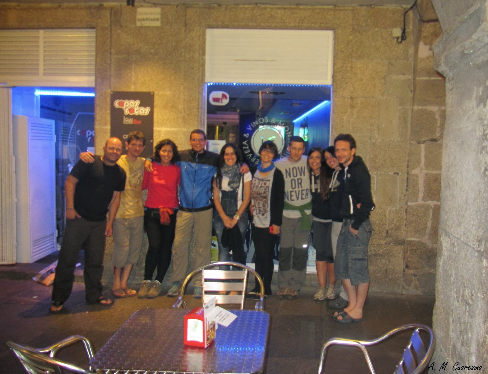 Cae la noche y marchamos a cenar. Esta vez lo hacemos con Antonio y Jorginho y con Inma y Cristina. Lo hacemos en un lugar pasable, llamado Copas Rotas. Tras la cena parte del grupo comienza a jugar al geocaching por Santiago mientras Mayka y yo vamos a comprobar que es lo que queda de aquella ruta llamada Paris-Dakar, de la Calle Francos. Donde dándote una cartilla debes comenzar a tomar algo por el primer bar llamado Paris y terminar en el Dakar, si puedes. Pero no son horas, ya están casi todos cerrados.