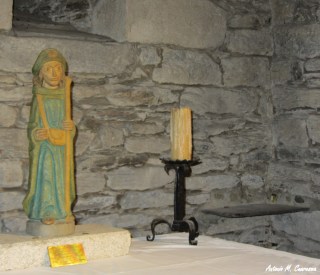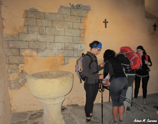 Tras este desayuno, cuasi ceremonial, proseguimos el Camino parando en diferentes iglesias, como la iglesia de San Juan Bautista en La Portela de Valcarce (47 hab.) (9º sello), donde dejo una estampa de San Mamés en una hornacina del muro de la izquierda donde se encuentra una talla de la Virgen con el Niño, y la iglesia de San Pedro de Ambasmestas (82 hab.) (10º sello), también aquí, en esta ocasión en otra hornacina a la derecha bajo una talla del Corazón de Jesús, dejo otra estampa de San Mamés. En su pórtico coincidimos con dos chicas (barcelonesa y argentina) y un muchacho con los que proseguimos nuestro camino hasta Vega de Valcarce (752 hab). En este municipio leonés entramos en la Iglesia de la Magdalena, a dejar otra estampa, en su interior hay tres andas montadas con las imágenes de La Inmaculada Concepción, San Antonio de Padua y la Magdalena, están de fiesta en esta bonita localidad. Siguiente parada, la iglesia románica de San Juan Bautista (s X-XI) de Ruitelán (81 hab.) (10º b sello. en el reverso de la credencial).