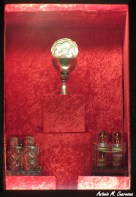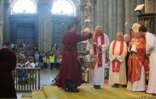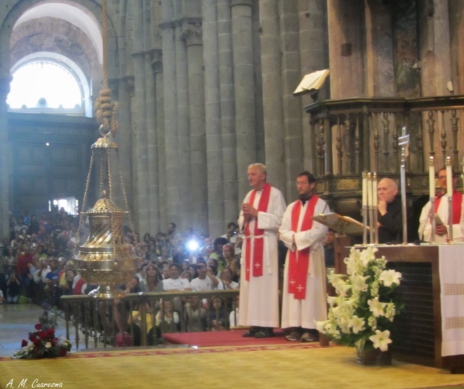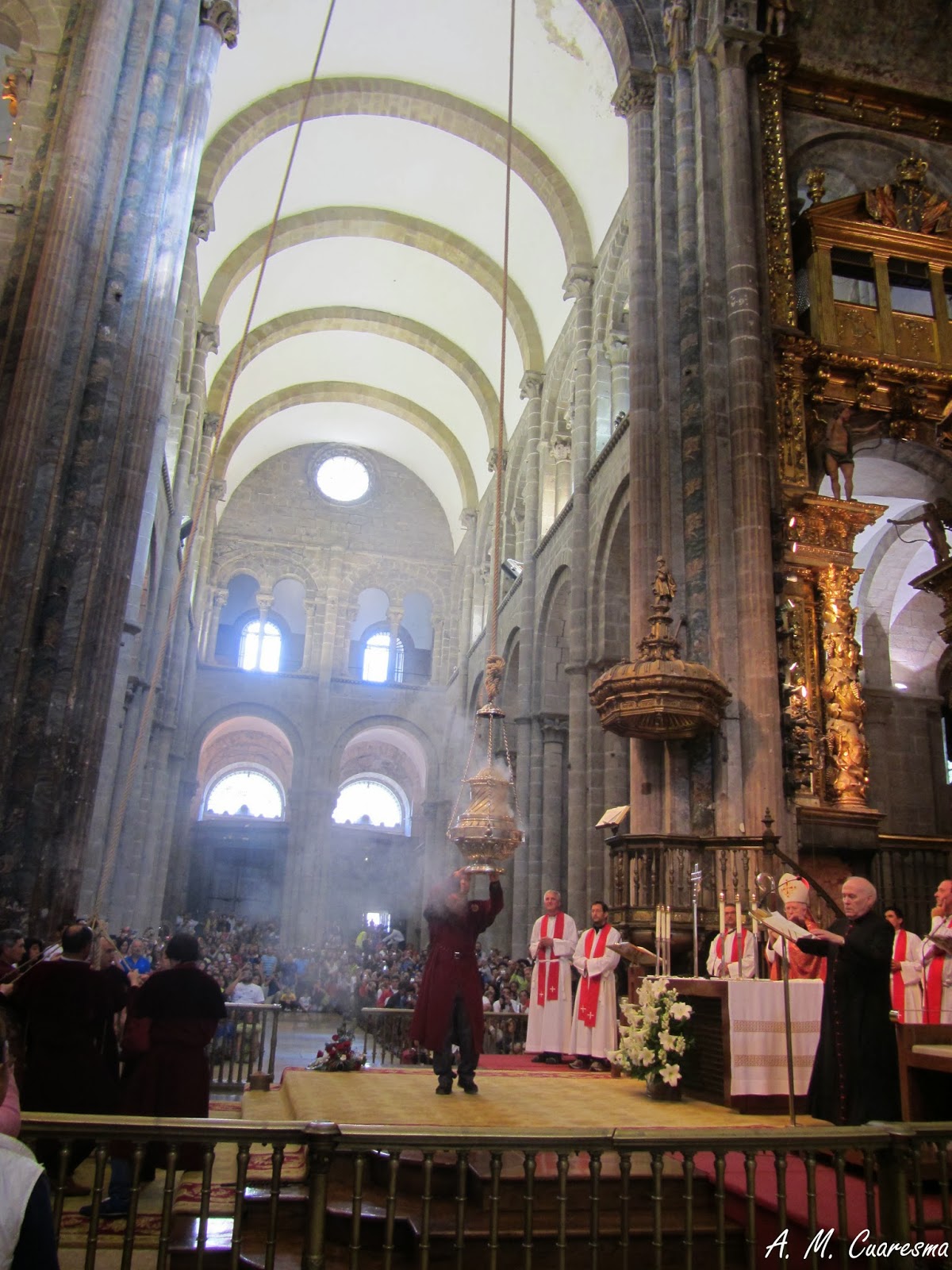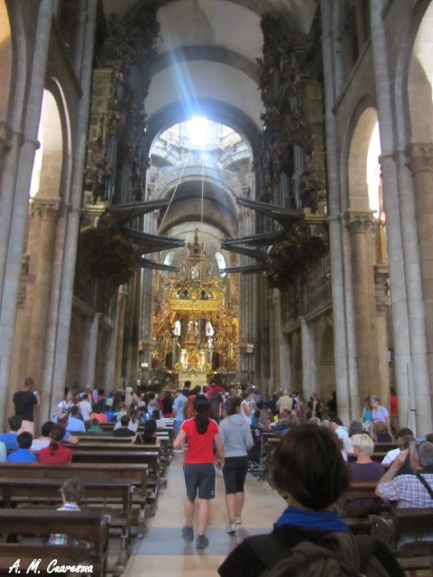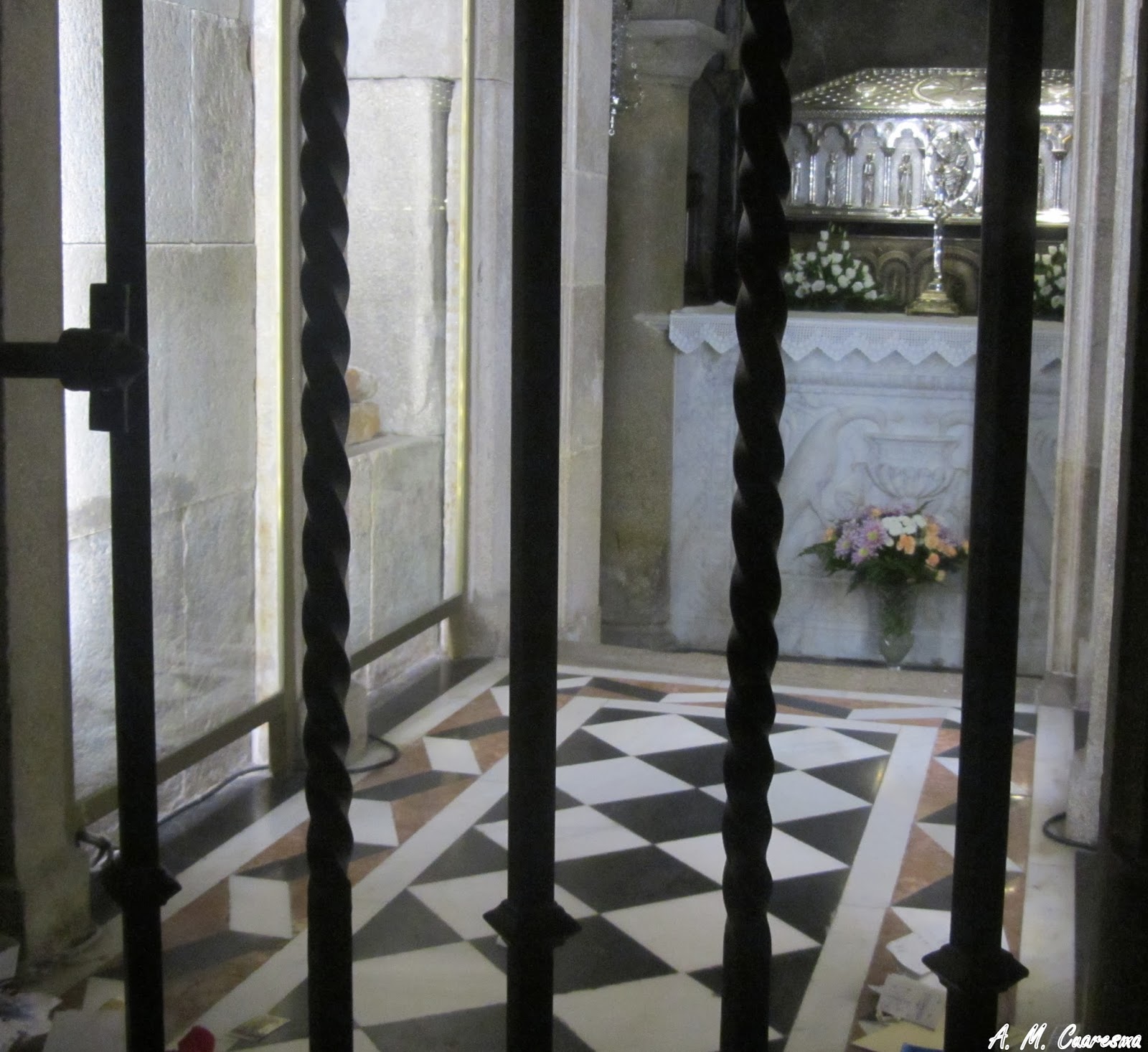 Entremos pues en el interior peregrinos. El Pórtico de la Gloriase encuentra en restauración y en realidad solo aquellos que paguen por visitarlo pueden hacerlo. ¡Vaya hombre!. Junto a la imagen de Salomé dejamos una estampa de San Mamés. Bajamos a ver el sepulcro del santo, como manda la tradición, terminando así oficialmente nuestra peregrinación. En una cripta bajo el altar mayor se encuentra en una urna de plata los restos del Apóstol.En él, también arrojaremos una estampa de San Mamés que nos ha acompañado durante todo el Camino. Tras estar un buen rato en su interior vamos hasta nuestra hospedería.