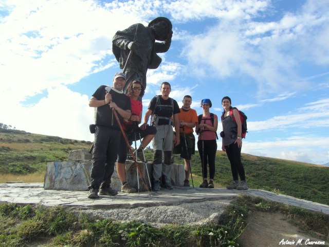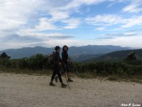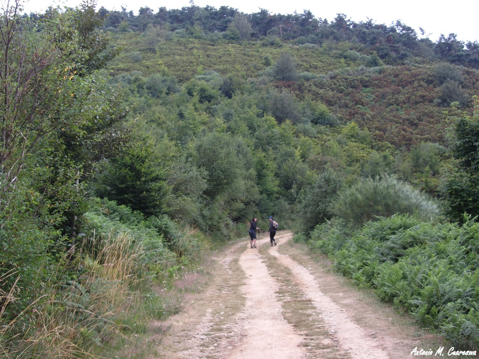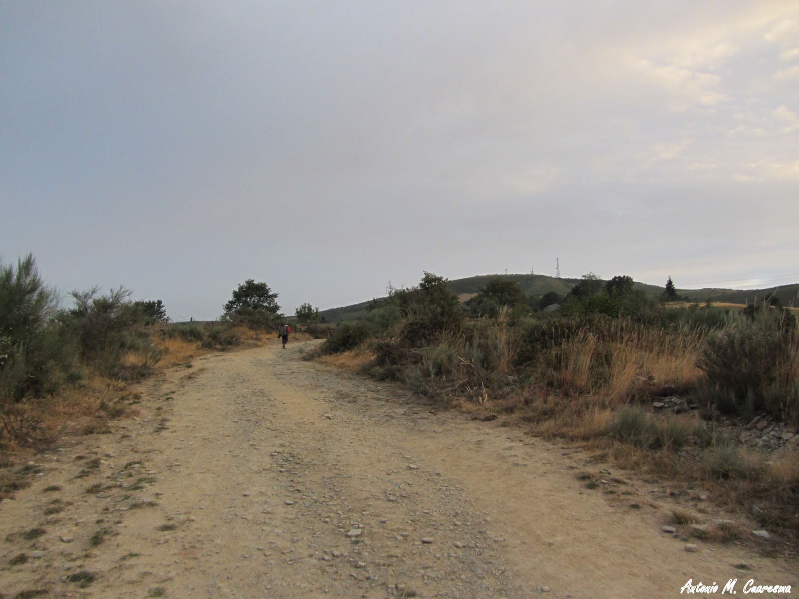 Aun queda subida. Caminamos por la cresta de la montaña, el sudor se vuelve perlas en la cabeza, parece que estamos iluminados por la proeza… a todo esto a lo largo del camino a unos veinte metros, un peregrino con una mochila de unos quince quilos, con el bastón guardado y con las manos atrás en los bajos de la mochila echa el resto para continuar con la ascensión… !asombroso mochilón!.