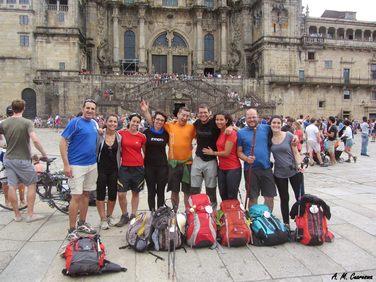 Abrazos, alguna que otra lágrimas y a no poder parar de mirar la fachada del Obradoiro de la Catedral de Santiago de Compostela. Soltamos la mochila y a modo de ritual del peregrino la ponemos de almohada y nos echamos en el suelo a seguir contemplándola y a calmar difícilmente la emoción. Se te vienen a la mente diferentes momentos del camino, imágenes desordenadas de toda la experiencia, miles de fotos que estarán para siempre en la mente.