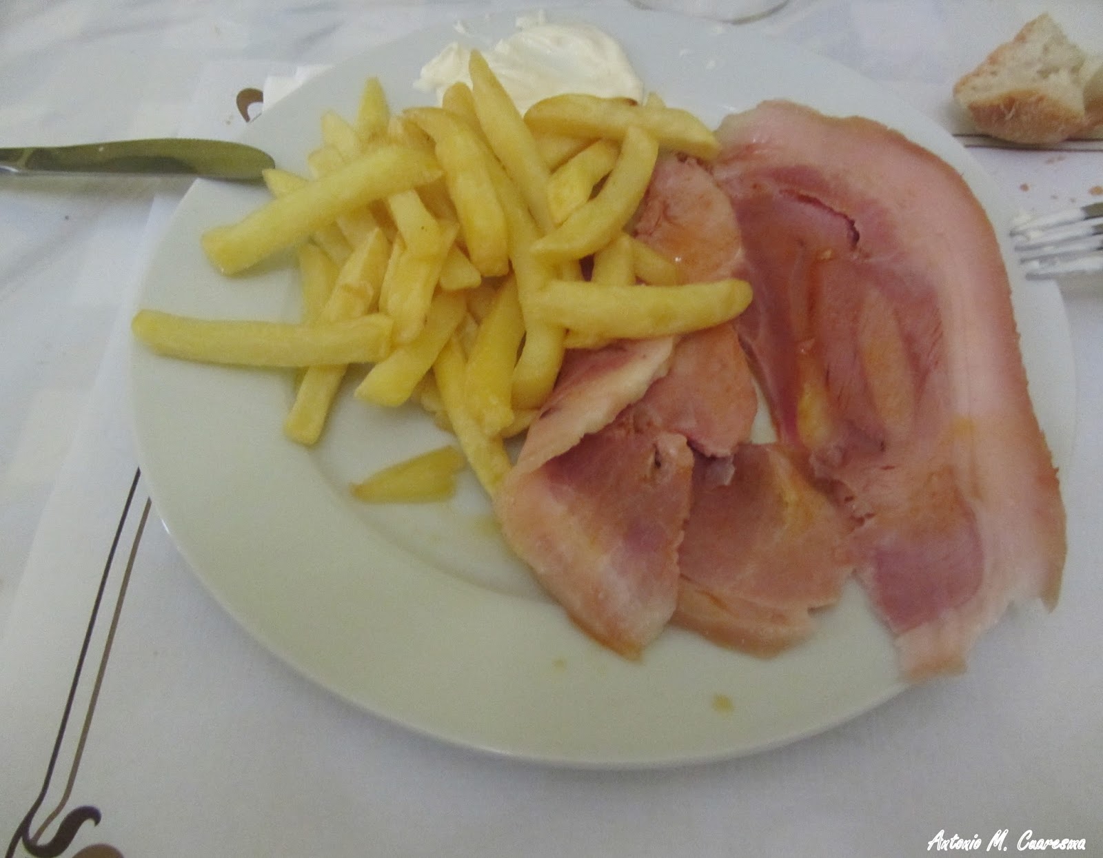 El negocio lo regenta un lugareño de carácter berciano, mientras una chica atiende a las mesas. Es esta la que nos trae el segundo plato, una bandeja de patatas fritas y otra bandeja de truchas, … de «mediano formato», que tras poner en la mesa todos nos quedamos mirando, al menos un servidor con la cara de aquel que no come frecuente trucha, y a esto va la chica que tras vernos las caras, pienso, dice:
