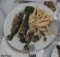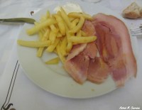 Y tras apartarnos todos un par de truchas y unas papas, continuamos comiendo, viniendo la chica al tiempo a la que le dijimos que trajera más, haciendo lo mismo con otras dos bandejas de similar tamaño. Comenzamos a apartarnos de la segunda, mientras todos pensábamos… ¿Estará incluido esto en el Menú?. Al preguntar nos dijeron que NO! … dieciocho euros se nos fue de más de lo que costaba el menú. Al menos Conce consiguió su azucarillo con la Catedral de Santiago!