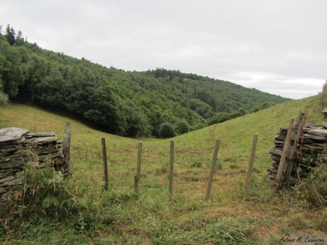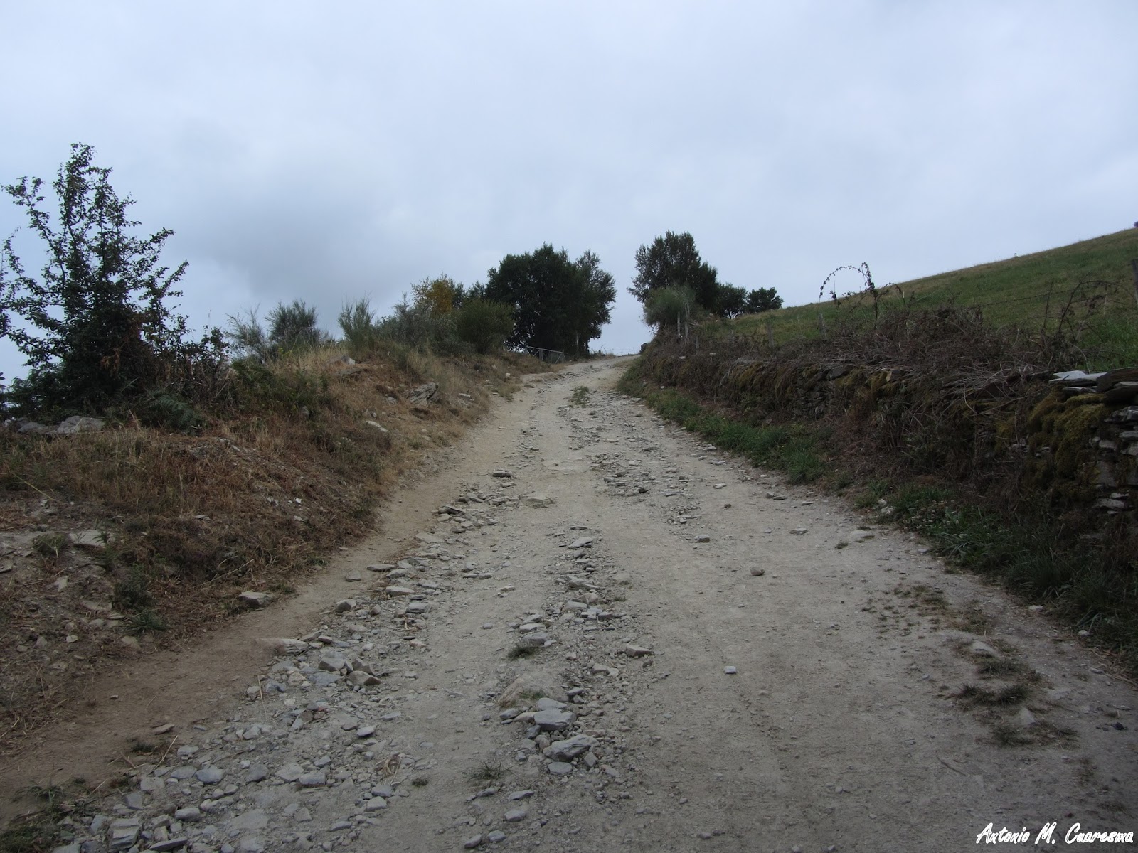 Hacemos un inciso aquí para hablar de la importancia del bastón, un compañero ineludible, nuestra tercera pierna, o quien lleve dos, sus otras dos piernas. Te ayuda en la subida, lo clavas en el Camino, y te agarras a él como si de un sustento fijo se tratase, es esencial para subir estas lomas, es la sujeción necesaria para poder pasar esta Etapa. Por cierto el que llevo de madera de no sé que árbol, es fantástico, y porta junto a la cuerda un exvoto de San Cristóbal que muy bien agarradito me lo puso Mayka, es un regalo suyo, ya que sabe de mi afición a estas cosillas prerromanas como son los exvotos. Además al ser rígido, ayuda poniéndolo a modo de travesaño en los hombros a descansar las mano y a abrir los pulmones. ¡Cuántas veces hago este gesto durante el camino!.