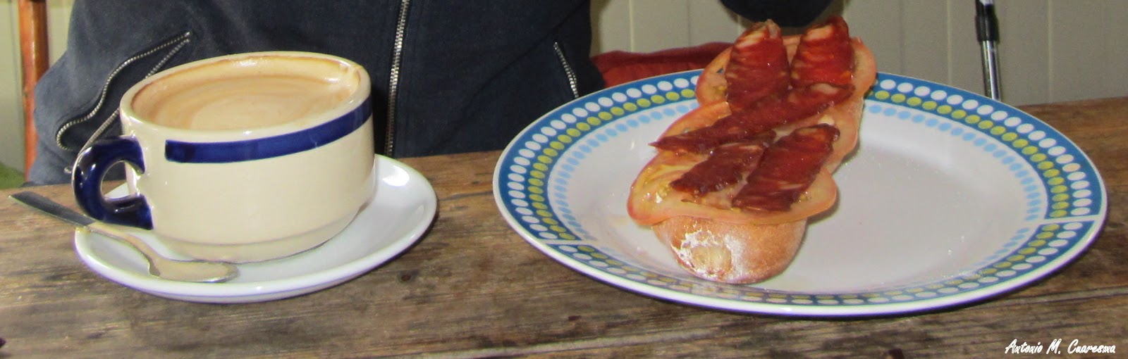 desayunar se ha dicho. Vamos al bar frente a la iglesia a tomar el cafelito y hacer tiempo. En el sitio no tienen tostadas, pero esto es suplido por un auténtico café con mayúsculas que sirve en vaso de sidra, si ha leído bien… en vaso de medio litro, el gozo es tan grande casi como la subida. Son múltiples las fotos que se lleva dicho «