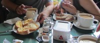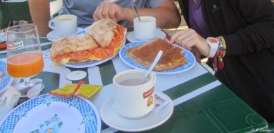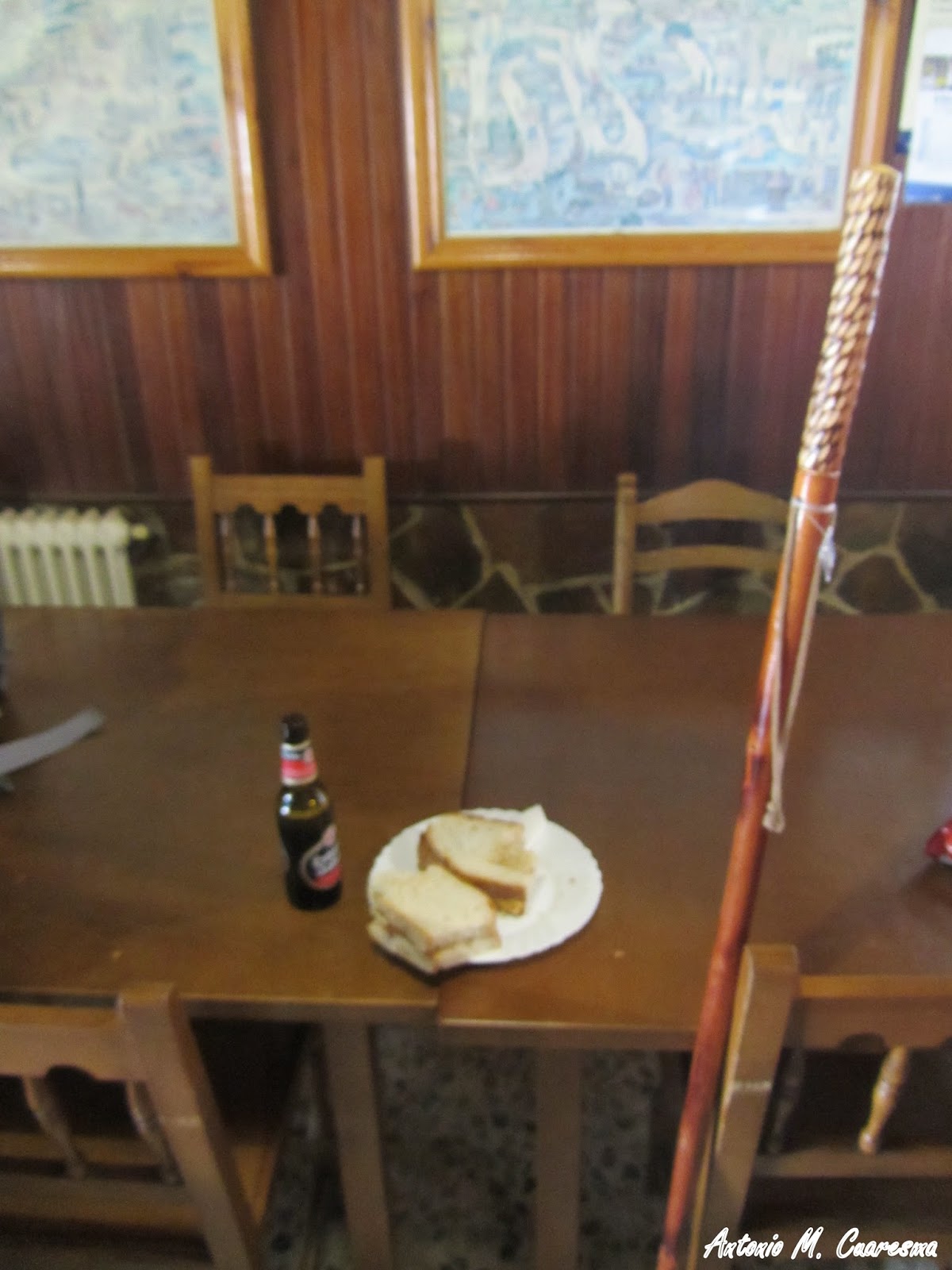 Paramos a desayunar en Trabadelo, en el bar Crispeta (8º sello) un buen café y pan tostado con aceite y tortilla, donde la camarera nos regala 6 «huesitos» para el camino.