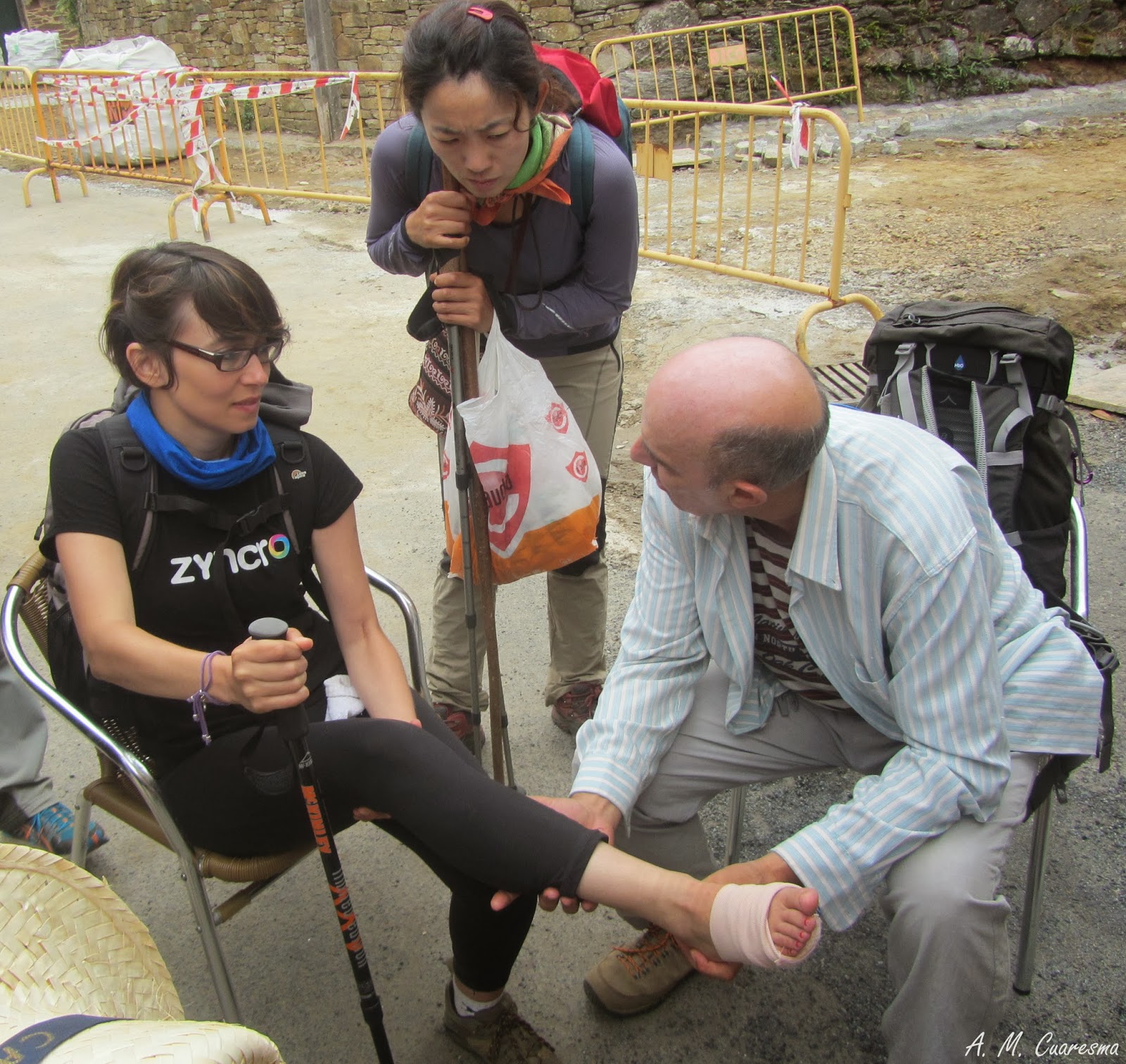 Tras el desayuno, al retomar la marcha, Conce se resiente un poco de su tobillo, y decidimos preguntar a un señor que veíamos hacer las funciones de medico que desayunaba junto a nosotros y este la atiende muy amablemente… Buena persona aquel hombre!.