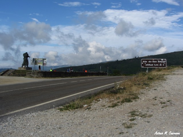 Vemos, a la salida de Liñares, una indicación que dice Triacastela a 19,5 Km. ¡Qué bonita es toda esta parte del Camino! Que sigue incluyendo la subida al Alto do San Roque, a una altitud de 1.270 m. Zona donde se encuentra una escultura colosal dedicada al peregrino. Punto de parada de peregrinos… ¡Buen Camino! nos decimos los unos a los otros. Y es que este es el saludo habitual en nuestros días que sustituyese aquel «Utreia«, recogido en el Códex Calixtitinus, que significa «vamos más allá». Los peregrinos entonces se saludaban diciendo «Ultreia, suseia, Santiago» con la respuesta del otro de «Et suseia» (Y vamos más arriba). Lo cierto es que más adelante sí, pero más arriba es imposible, las vistas muestran que estamos en lo más alto y todavía queda el Alto do Poyo.
