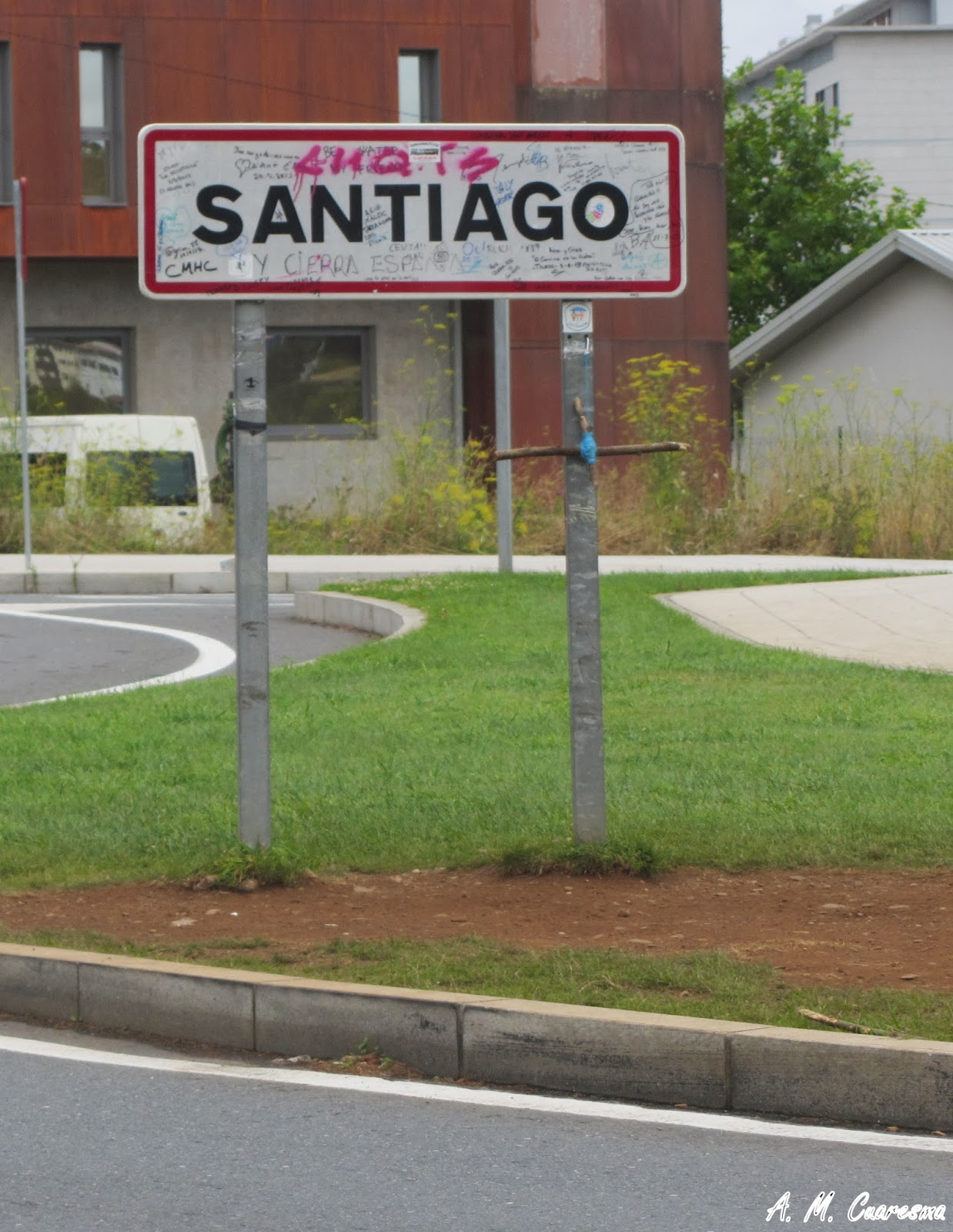 A las once y cuarenta, del día doce de agosto, de dos mil trece, hacemos entrada en la ciudad de Santiago de Compostela, así lo indica su cartel de inicio de la ciudad. Bien grafiteado, por cierto.