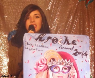Una de las personas que se ha encargado desde la guardería, de introducir desde niños la llama del carnaval en nuestro interior. El pregón, realizado como algo novedoso este año en la carpa, es animadísimo y de muy bella factura. La pregonera consigue que haya representados en el escenario chirigoteros de los 25 años del carnaval de Aroche, hay disfraces desde los bebes, hasta los gambrinus.