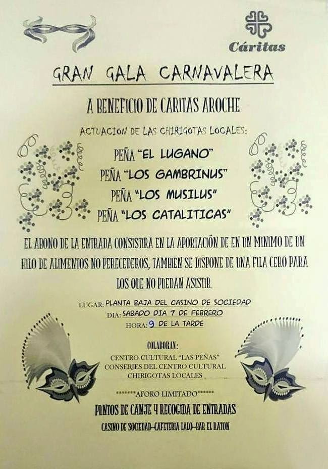 Los actos previos al Carnaval de Aroche continúan durante el mes de febrero, en esta ocasión con una gala benéfica carnavalera en colaboración con Cáritas Aroche: