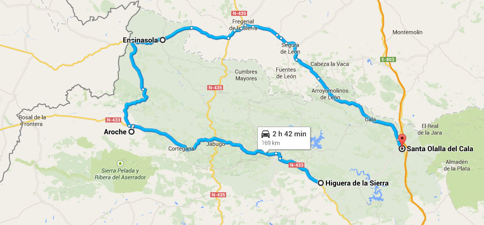 Desde Aroche te puedes desviar por la carretera H-9003 hacia Encinasola y seguir conociendo más pueblos de la Sierra pero por su parte más al norte. (Enlace con la carretera C-439, dejando al otro lado la visión del pueblo portugués de Barrancos). De Encinasola y pasando en parte por Extremadura (EX-301, enlazando con la N-435 y más tarde con la EX-201) se llega, por la A-434, hasta Arrollomolinos de León, a continuación por Cala y a través de la N-630 a Santa Olalla del Cala para enlazar de nuevo con la Autovía de la Plata.