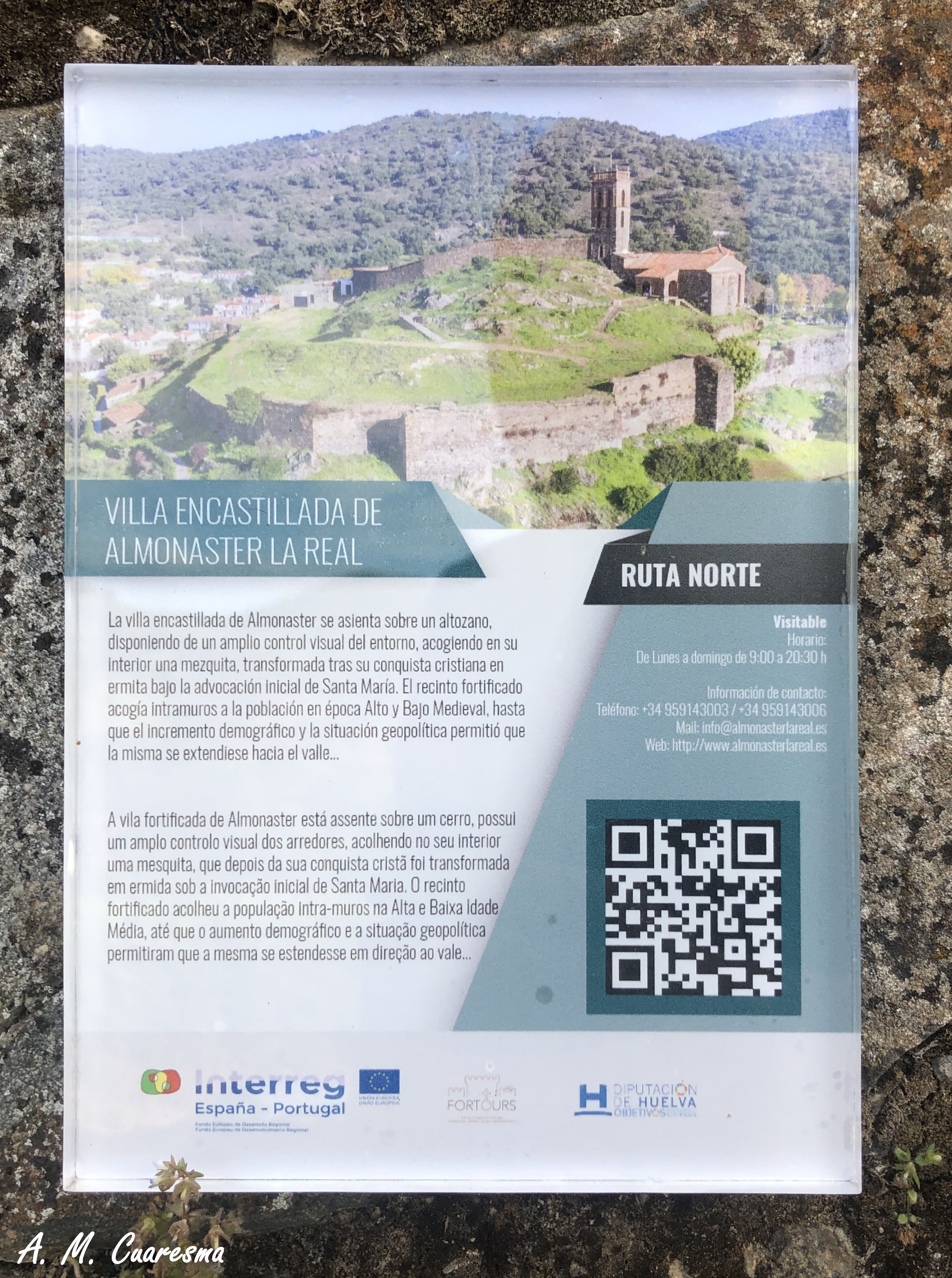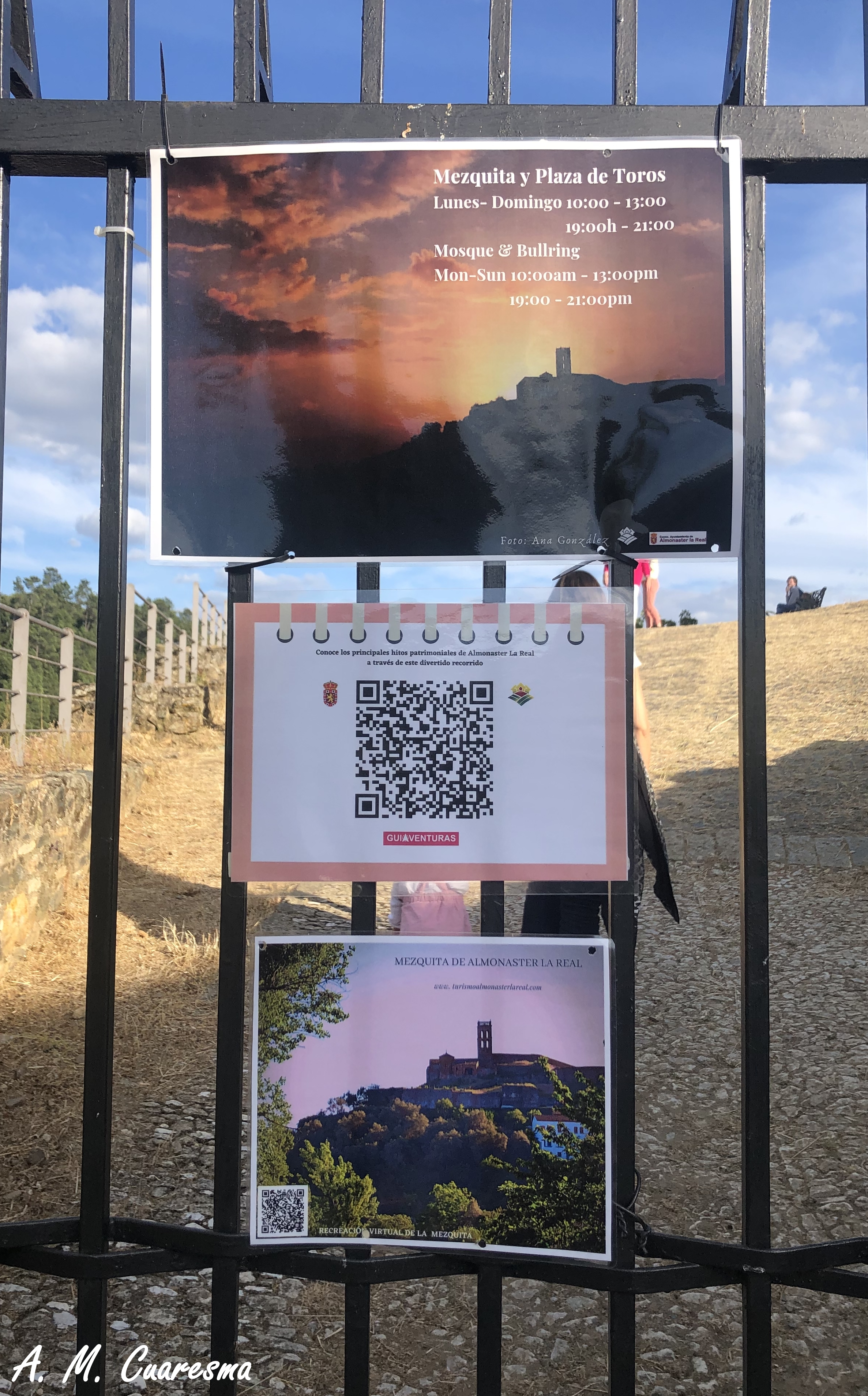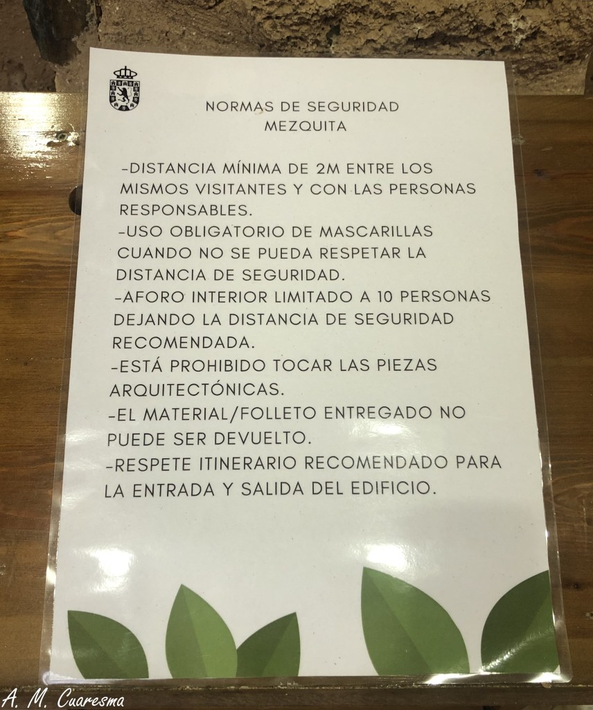 Justo en el acceso al recinto fortificado donde se encuentra la mezquita y la plaza de toros, hay toda una serie de cartelería con códigos QR en los que poder consultar diferentes informaciones referentes tanto a la mezquita como a Almostar la Real en general. Es este medio uno de los más utilizados a partir de esta nueva normalidad en la que cada uno de nosotros, con nuestros dispositivos móviles, podremos tener una guía de lo que vayamos a visitar, sin tener que utilizar y malgastar papel para los folletos que ne muchas de las ocasiones quedan tirados por el empedrado de nuestros pueblos. Algo que como comprobamos es totalmente compatible con las interpretecaiones del lugar por medio de un mediador cultural que haga las explicaciones oportunas y personalizadas de nuestra visita en un momento determinado, siendo el uso del QR algo standar e impresonal.