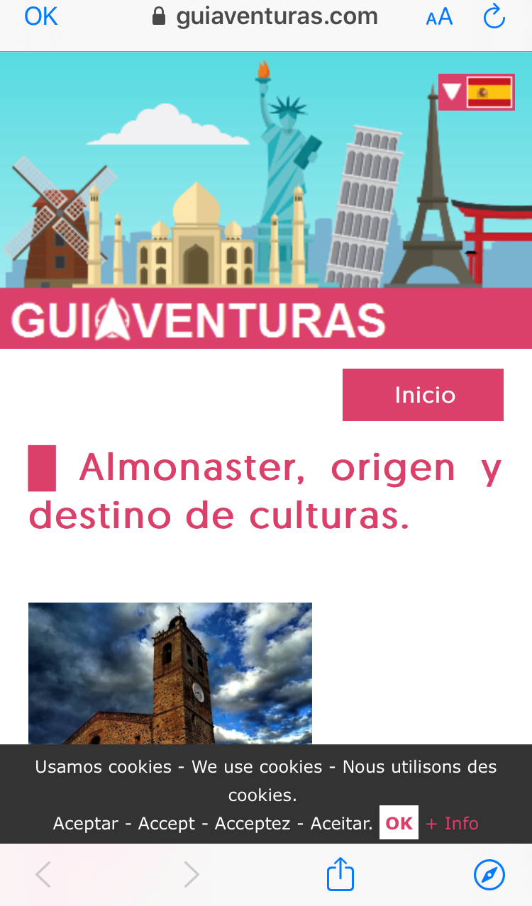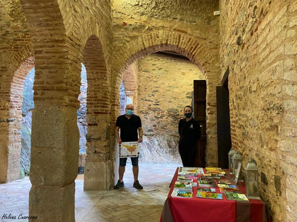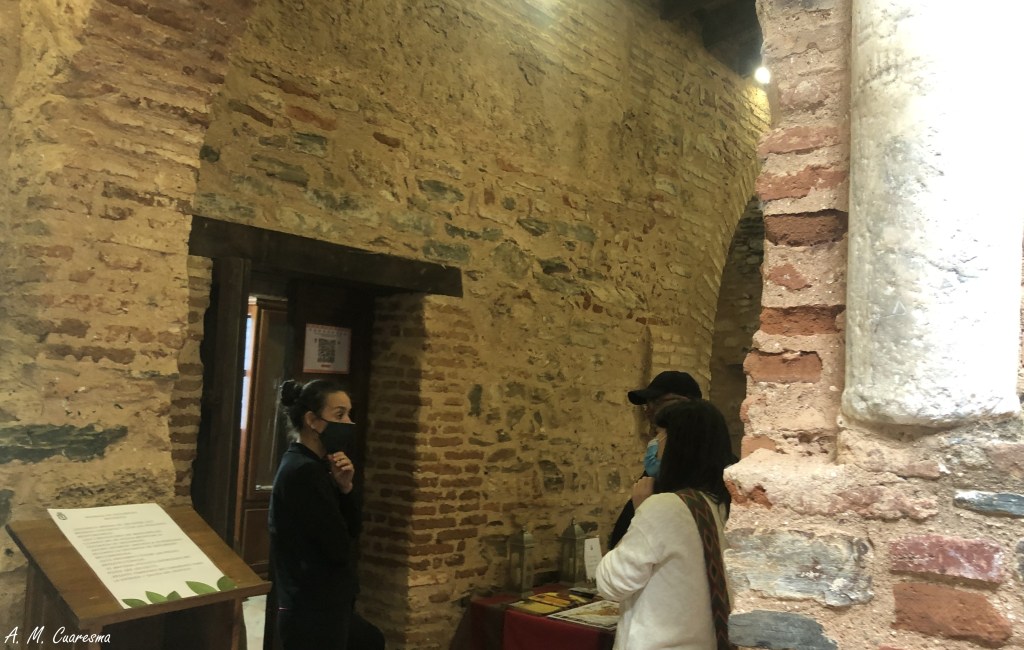 Estuvimos charlando con Elena, responsable del centro de recepción que se había trasladado en este momento hasta la mezquita, donde tenían toda la información turística no solo de Almonater la Real, sino de diferentes lugares serranos. Nos hablo de la afluencia de personas durante la apertura del monumento, incluso nos cruzamos con una ruta cultural guiada por Ismael para las personas que se alojaban en el Hotel Luz Almonaster, que se dirigían a la Tenería tras la visita de la mezquita.