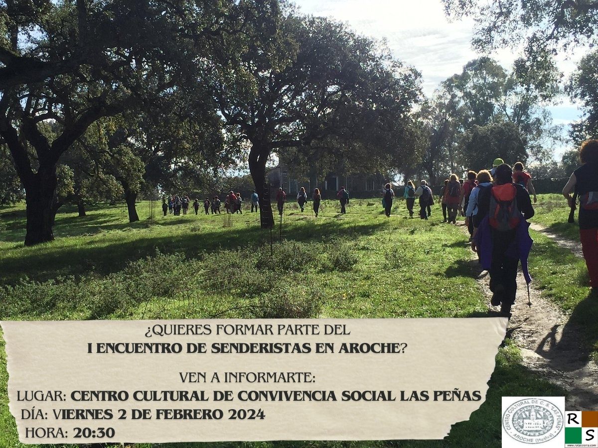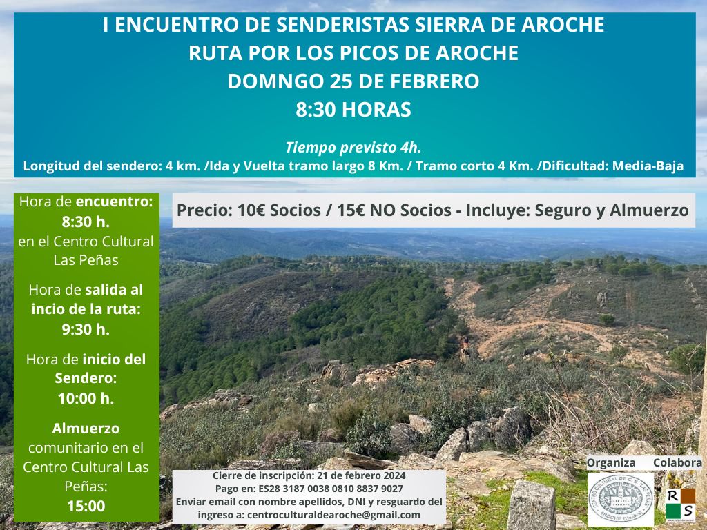 Como primera actividad se propuso la realización del I ENCUENTRO DE SENDERISTAS SIERRA DE AROCHE, con la realización de una «Ruta por Los Picos de Aroche». El evento, organizado por el Centro Cultural Las Peñas y en el que colabora la Asociación Rutas Sierra, se realizará el domingo 25 de febrero de 2024, teniendo como orden del día el siguiente: