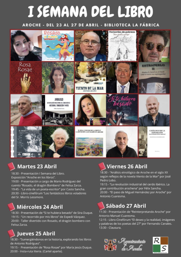 Desde el martes 23 de abril de 2024 y hasta el sábado 27 de abril una serie de escritores arochenos hablarán de su experiencia con el preciado objeto que es el libro, todos ellos escritores que tienen a la localidad arucitana como referente. Los actos se desarrollarán en la sede de la Biblioteca La Fábrica de Aroche sita en la Calle Rábida nº 7.