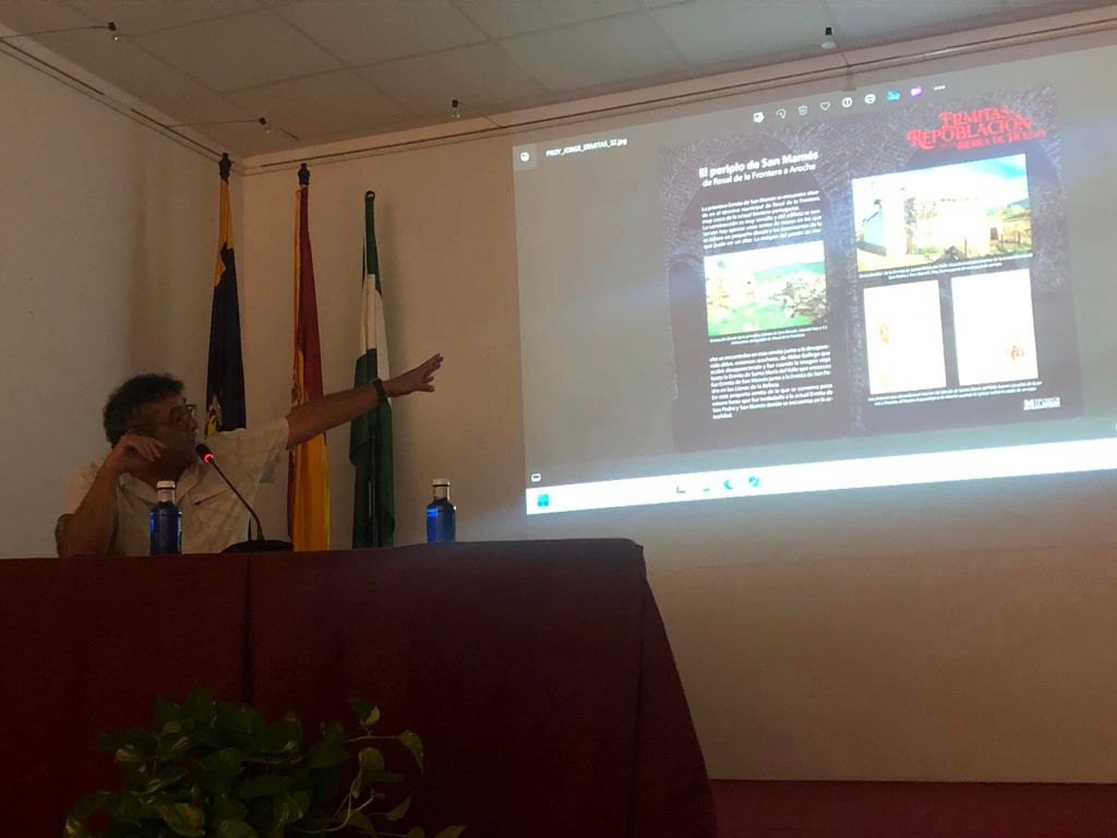 A continuación, le siguió la participación de D. Jorge Garrido, fotógrafo profesional, que lo ha sido de la Agencia EFE, Grupo Joly, Grupo Vocento, Prisa, entre otros, es técnico superior en artes plásticas y diseño especializado en fotografía artística en la Escuela León Ortega de Huelva. Ha ejercido como profesor de fotografía en la Universidad de Cádiz y trabajado como fotógrafo por España, Portugal, Egipto, Maldivas, Cuba y Tailandia. En la actualidad está moviendo por la provincia de Huelva a través de la Diputación Provincial su exposición Ermitas de Repoblación de la Sierra de Huelva, con la que participa en este encuentro con la muestra «Ermitas en la Sierra de Huelva en la época de Alfonso X. Comentarios sobre las imágenes de la Exposición Ermitas de Repoblación», en la que nos paseo por edificios significativos repartidos por la geografía serrana onubense que pertenecen, mucho de ellos, a la época de realización de las Cantigas de Santa María.