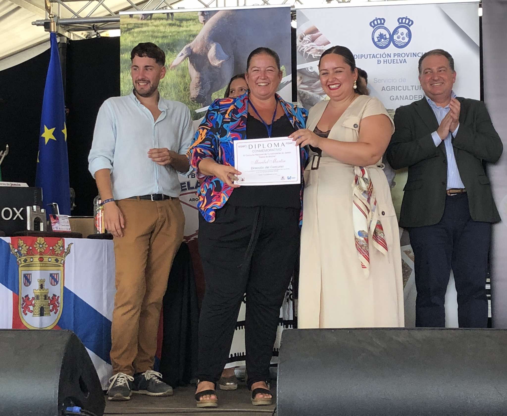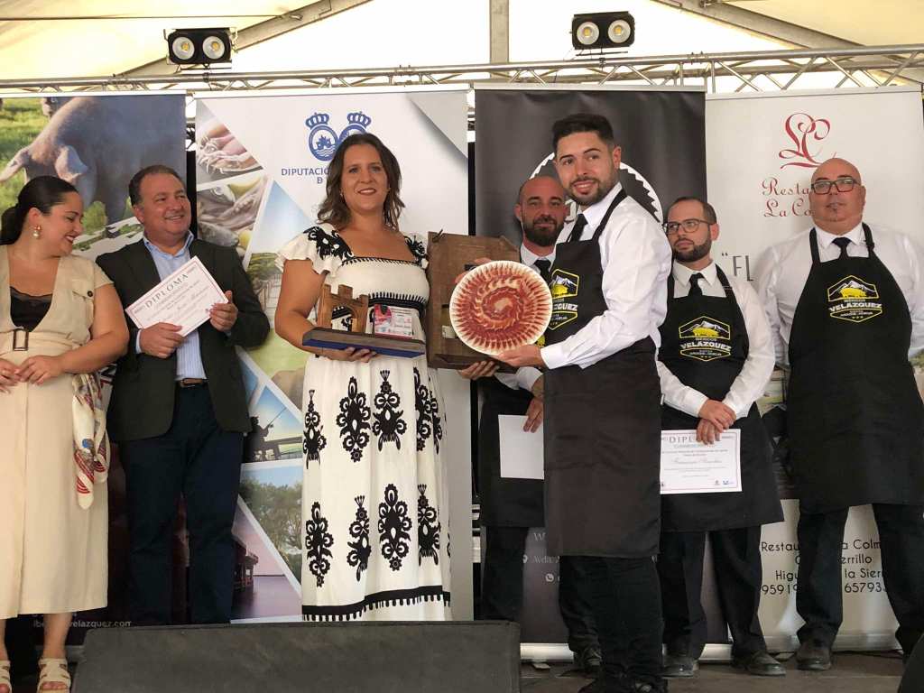 Primer Premio: Francisco Sánchez, de Fuentes de León. Galardón y tabla Afinox de Ibéricos Velázquez, entregado por Cristina Romero, Alcaldesa de Aroche y Eusebio Romero de Ibéricos Velázquez.