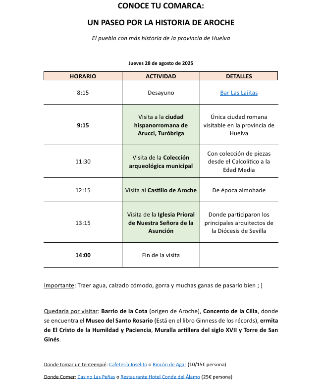 Desde Navahermosa contactaron con Rutassierra para que junto a la Oficina de Turismo de Aroche organizáramos una visita de una mañana por el municipio y este fue el resultado: