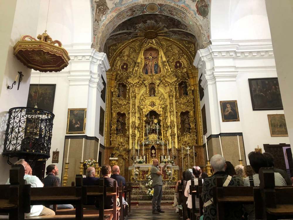 La iglesia de San Miguel es uno de esos edificios que alberga murales de diferentes épocas que van de las primeras realizaciones barrocas del tercer cuarto del siglo XVIII que se aprecian en en presbiterio, arco triunfal y pechinas, donde se representan a los evangelistas. Un segundo momento pictórico donde se decora con pintura mural la capilla de la patrona de la localidad, la Virgen de los Remedios, con pinturas de Rafael Blas Rodríguez en el año 1933. Se hablo sobre las pinturas que representan ángeles del martirio en la cúpula del Sagrario donde se encuentra la talla del nazareno. Y cuál fue la sorpresa, pues que una vecina nos advirtió que desde pequeña lo que parecía ser una pintura en lienzo ella aseguraba que desde siempre se había hablado de que era un mural… y efectivamente, descubrimos entre todos un nuevo mural justo en la entrada de la sacristía en el testero de la nave de la epístola.