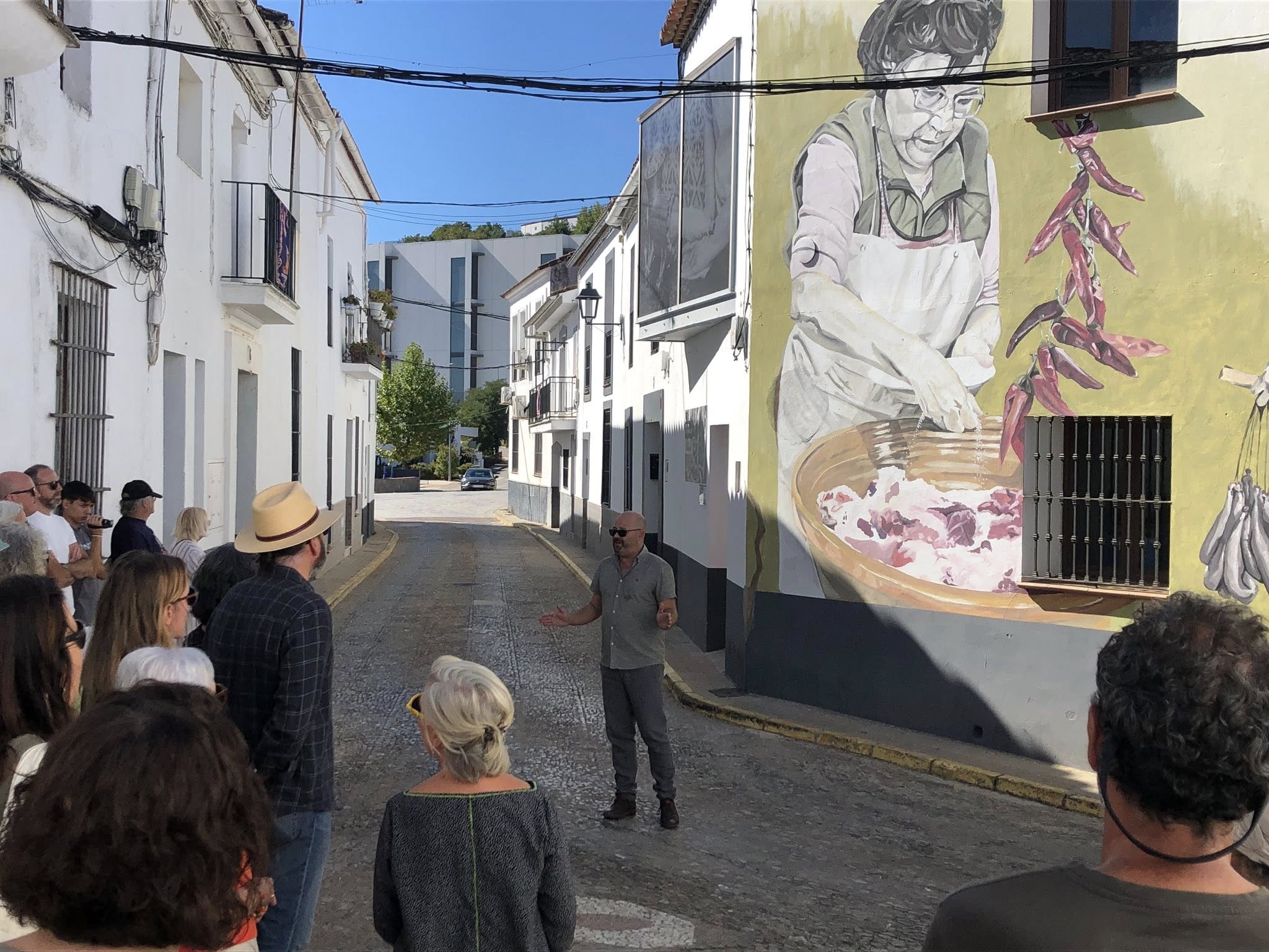 La siguiente parada fue ante el mural titulado conservando el invierno, realizado en el febrero de 2024 por Natalia Escaño López en la que se representa a la jabugueña Isabel aliñando la carne y a su cuñado que se conocía cariñosamente como «el tata» colgando los chorizos.