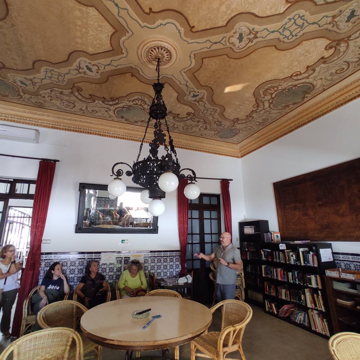 Finalizamos nuestro itinerario bajo los techos de uno de los salones nobles con los que cuenta el Casino Central, con motivos pictóricos realizados por Rafael Blas Rodríguez en 1933. Un artista natural de Sanlúcar la Mayor, formado en los círculos culturales sevillanos de principios del Siglo XX, cuya primera obra en la Sierra las realiza en la localidad de Jabugo, contando también con pinturas suyas en la iglesia de San Ana la Real y en el Santuario de la Reina de los Ángeles en Alájar.