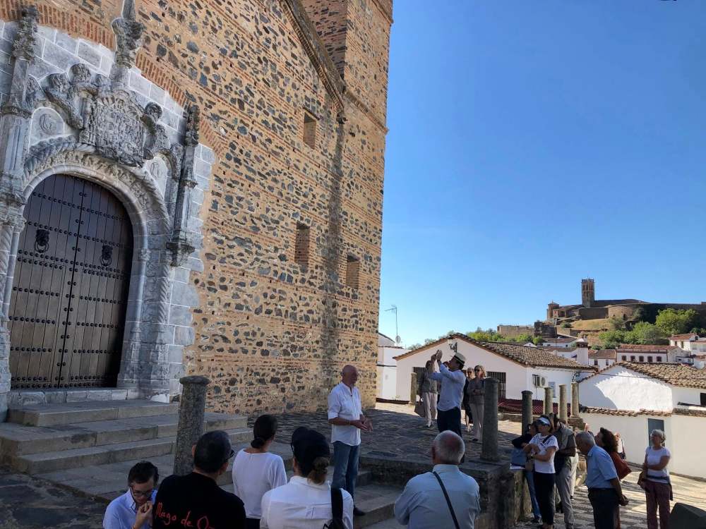 Tras realizar una bienvenida del encuentro en la Oficina de Turismo, donde se ubica la Sala de Exposiciones legado Manuel Vázquez Vargas, visualizándose varios vídeos sobre las tradiciones festivas de Almonaster la Real, nos dirigimos a uno de los puntos de encuentro, entre España y Portugal, de los muchos que existen en la Sierra, símbolo de unión entre Andalucía y el Alentejo portugués, como es la portada de estilo manuelino de la parroquia de San Martín.