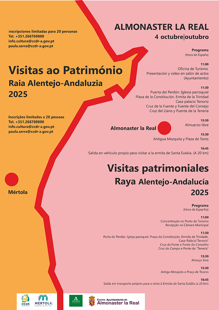 Desde el CCDR Alentejo y la Junta de Andalucía se están proponiendo una serie de encuentros patrimoniales entre pueblos de la Raia. Un hermanamiento a través de una cultura compartida, impulsada por las instituciones de los municipios implicados. Si en el año 2024 se produjo entre la localidad de Aroche y Serpa, este año 2025 la iniciativa ha sido llevada a cabo entre la Cámara Municipal de Mértola y el Ayuntamiento de Almonaster la Real.
